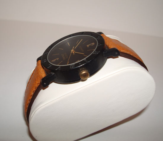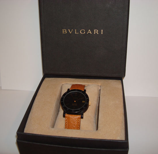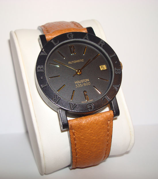 Description :limited edition of 600 pieces by city (335/600 Houston), carbon and gold, bezel with Bulgari letters, automatic movement, mineral glass, 33 mm diameter, transparent back cover, date, central seconds, screw crown, brown leather strap, carbon buckle closure.