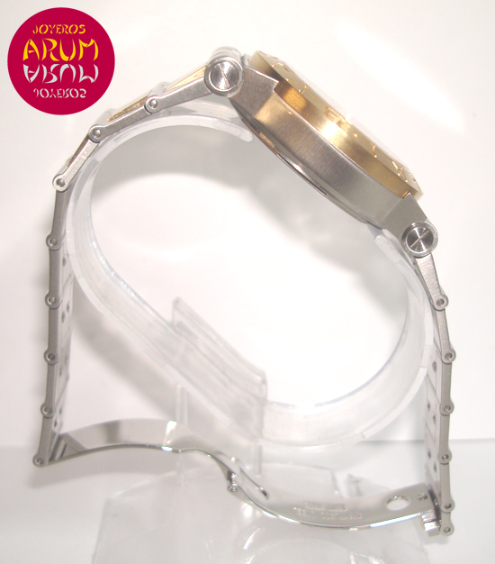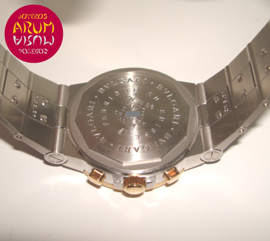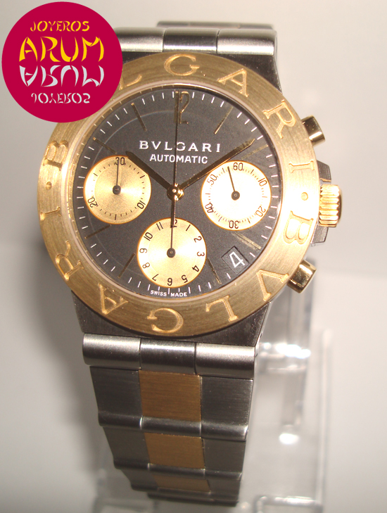 Description :steel and yellow gold, black dial, bezel with letters Bulgari, sapphire crystal, automatic movement, chronograph, three indicators on the dial, minutes, hours, small seconds at six, date between four and five, screw crown and two buttons, diameter 36 mm, waterproof 30 meters, steel and gold strap, buckle closure.