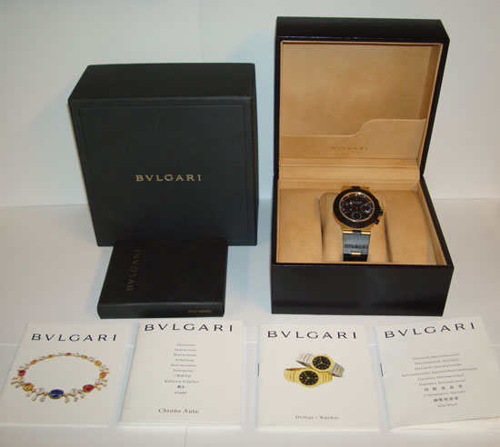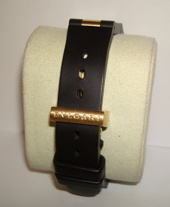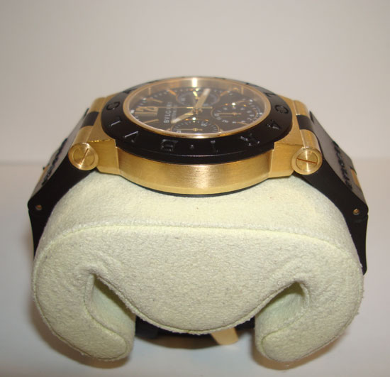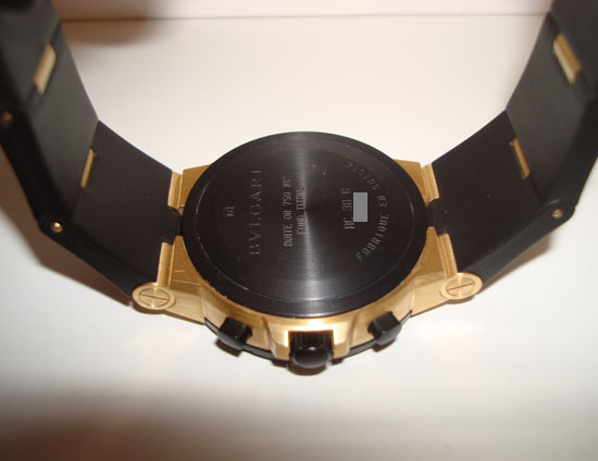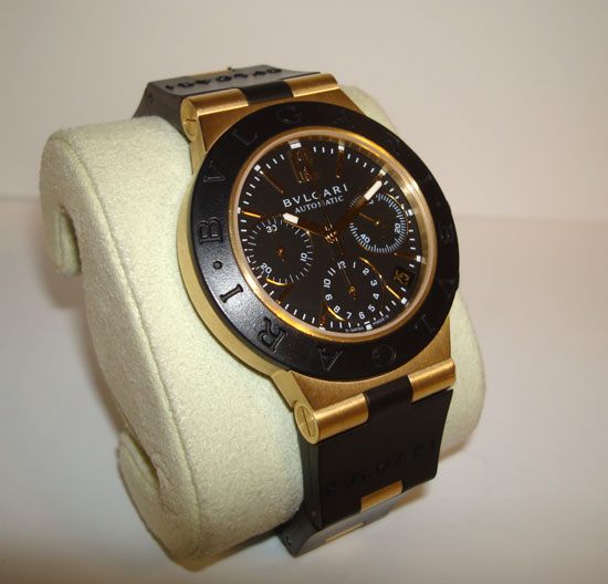 Description :rubber and gold, black dial, bezel engraved with letters Bulgari, sapphire crystal, automatic movement, chronograph, 3 indicators on the dial, seconds, minutes and hours, handles with luminescent indicators, central seconds, date, screw crown and two buttons, diameter 38 mm, rubber strap and gold, gold folding clasp, year 2008.