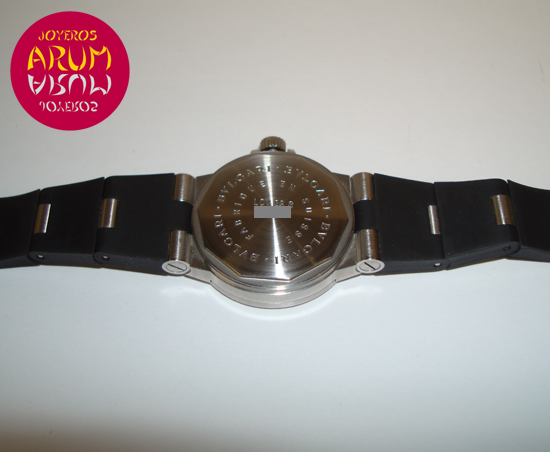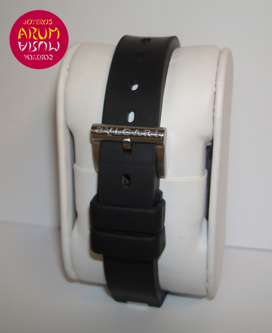 Description :lady’s watch, steel, black dial, bezel engraved with letters Bulgari, sapphire crystal, automatic movement, center seconds, luminescent handles and dial, date at three, diameter 29 mm, screw crown, rubber strap, buckle closure steel.