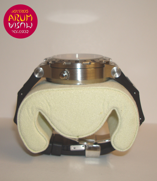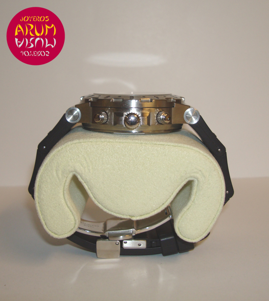 Description :steel, silver dial, sapphire crystal, bezel with 24 hours scale, automatic movement, chronograph flyback (different measurements in two clicks instead of four), three indicators on the dial, seconds, minutes and hours, date between four and five, depending GMT (second time zone), handles and luminescent dial indicators, diameter 40 mm, waterproof 100 meters, rubber strap, steel folding clasp.