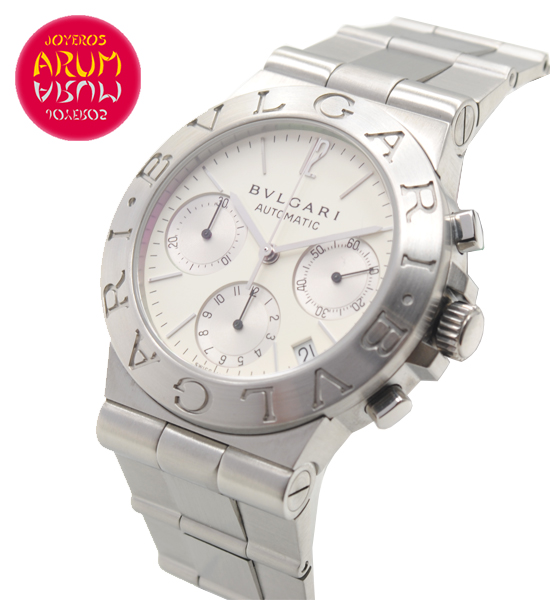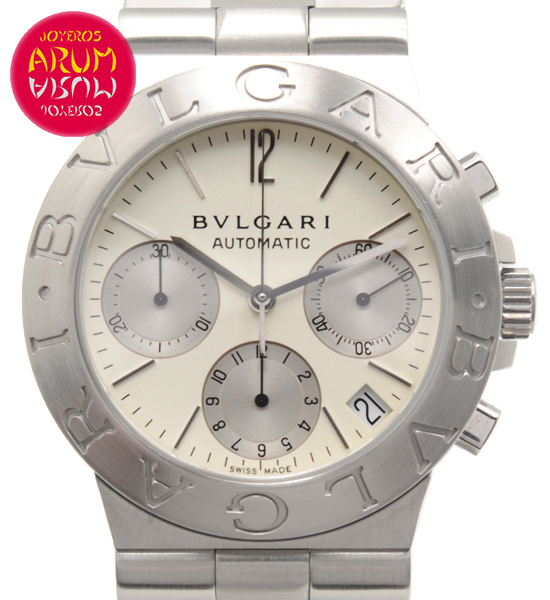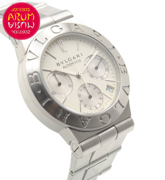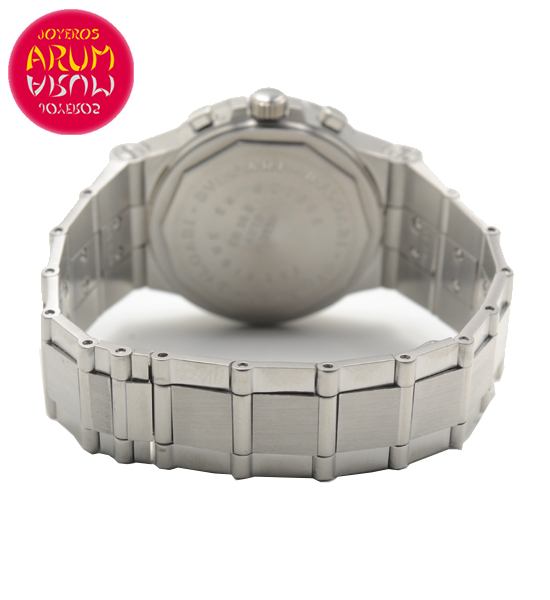 Other specifications :fixed bezel with Bulgari logo engraved, chronograph, date between four and five, small seconds at thee, hour counter at six, minute counter at nine, screw crown. Year 2002.