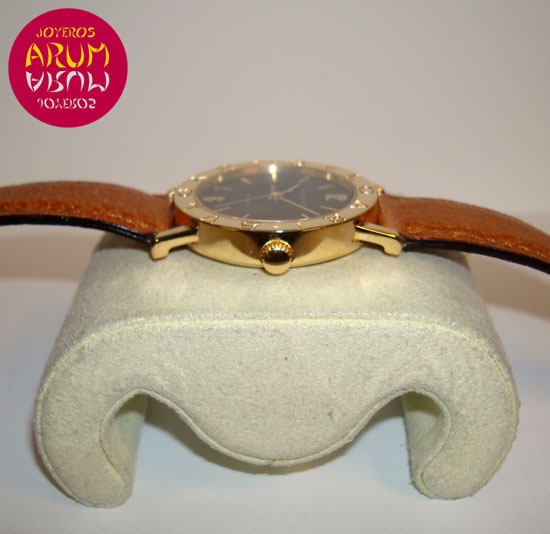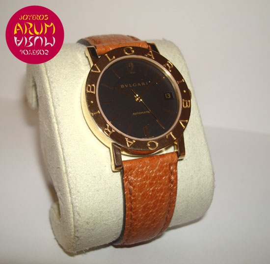 Description :yellow gold, black dial, fixed bezel engraved with letters Bulgari, sapphire crystal, automatic movement, central second, date at three, 33 mm diameter, brown leather strap, buckle closure.