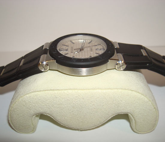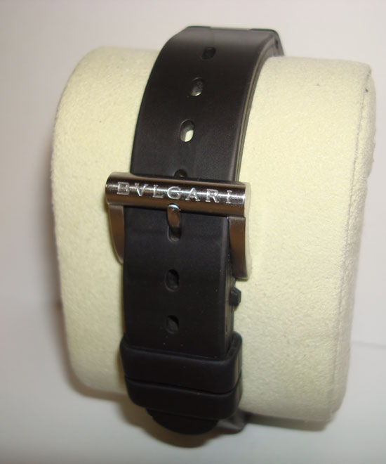 Description :steel, white dial, rubber bezel with letters Bulgari, sapphire crystal, automatic movement, central second, date at three, diameter 35 mm, screw crown, rubber strap, steel buckle closure.