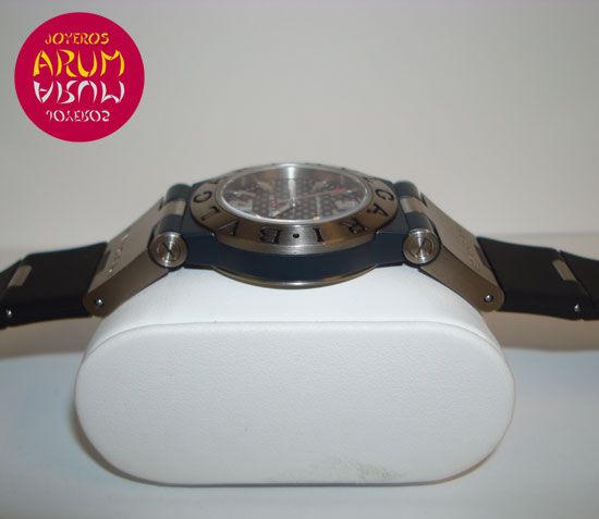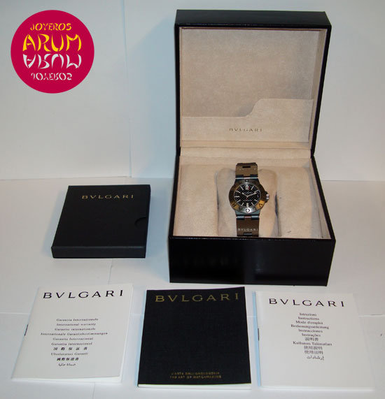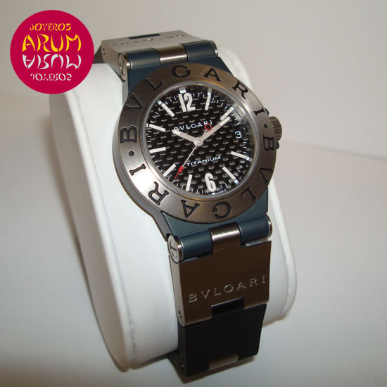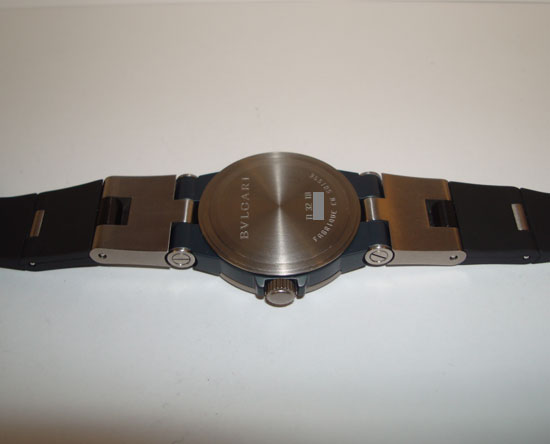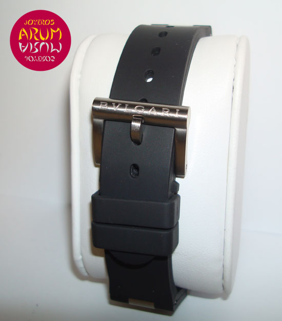 Description :lady watch, titanium, black dial, bezel engraved with letters Bulgari, sapphire crystal, quartz movement, central second, date at three, handles and luminescent dial, screw crown, diameter 32 mm, articulated rubber strap, buckle closure aluminum, year 2010.