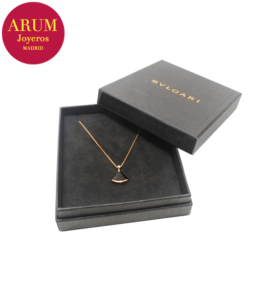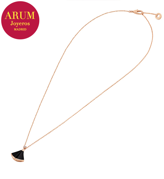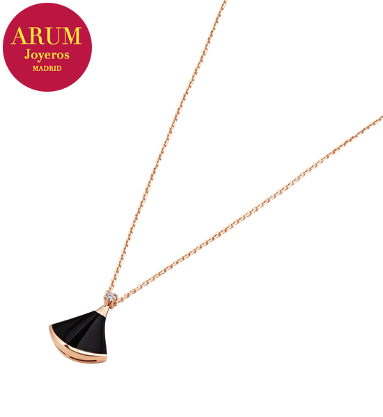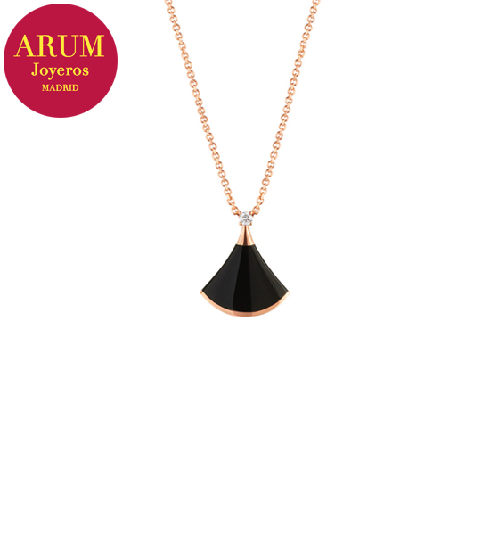 Description: Bulgari pendant and chain made in 18K pink gold with onyx and diamond 0.03 ct. Chain size is 40 cm. Pendant diameter is 1,5 cm.
