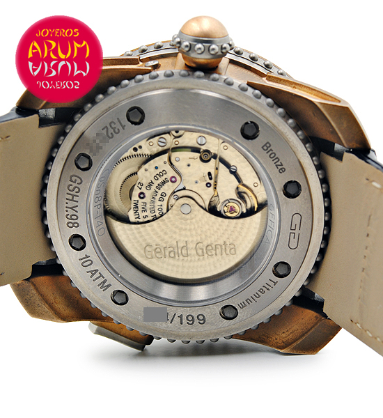 Other specifications :limited edition 199 pieces, caliber Gerald Gentra, retrograde minutes jump system, date at twelve, GMT function (second time zone) between six and nine, moon phases between three and six, transparent caseback, year 2013.