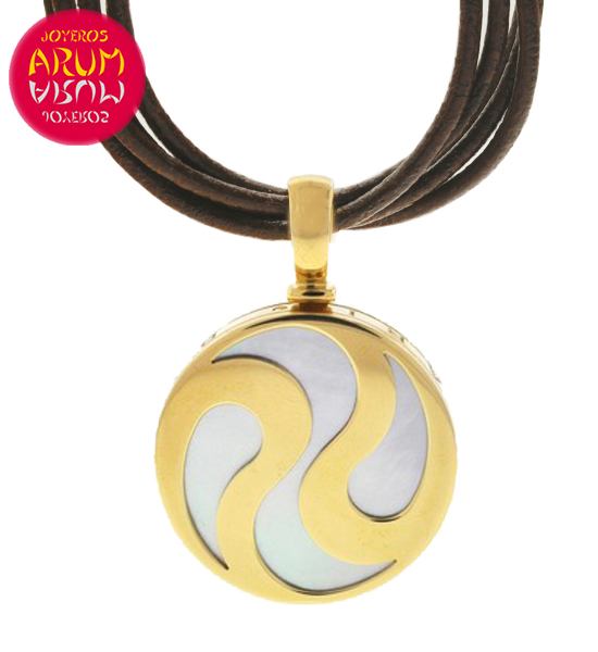 Description: Bulgari Yin Yang pendant made in 18K yellow gold with mother of pearl. Includes brown cord leather. Diameter is 3 cm.