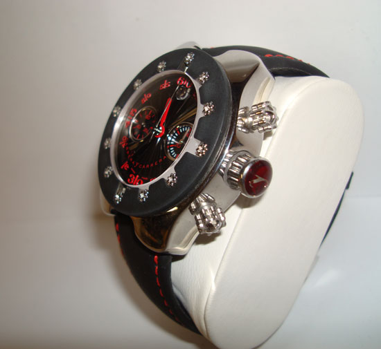 Description :steel, screwed bezel, sapphire crystal, 2 indicators on the dial, chronograph, date at twelve, screw crown and two buttons, diameter 40 mm, waterproof 50 meters, transparent back cover, black leather strap with embroidered red, steel folding clasp.