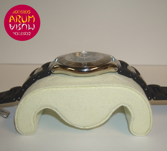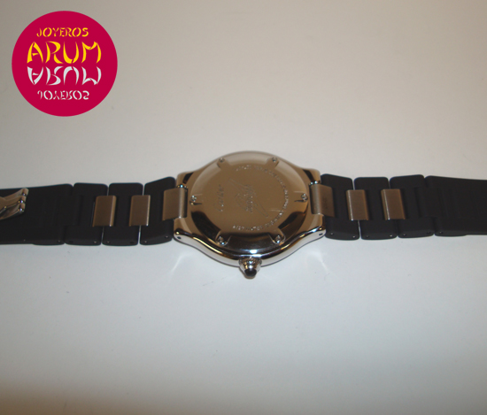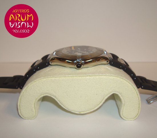 Description :steel, dial decorated with the double C Cartier, bezel with roman numerals, sapphire crystal, automatic movement, handles and luminescent dial, center seconds, date with magnifier at three, crown with black rubber protector, diameter 36 mm, strap rubber, steel folding clasp, year 2009.