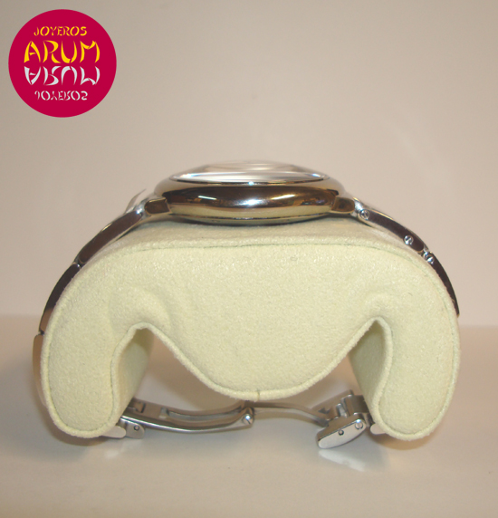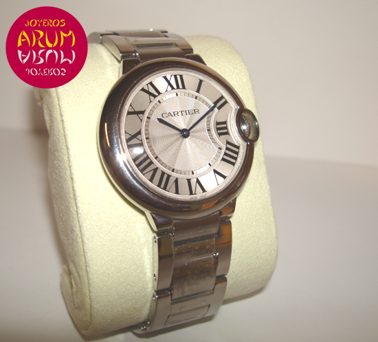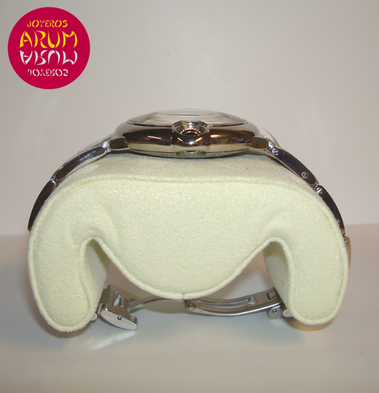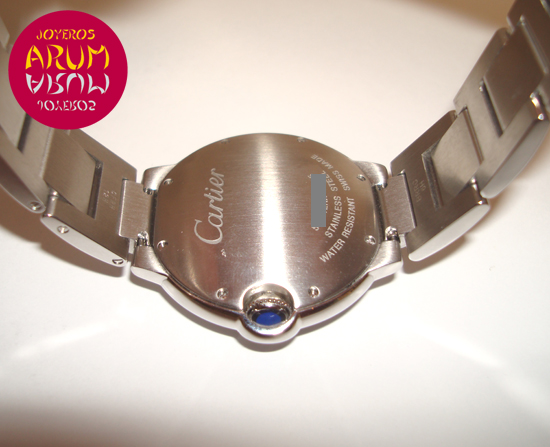 Description :steel, silver guilloche dial, smooth bezel, roman numbers, sapphire crystal, quartz movement, Cartier caliber 690, blued steel hands, crown decorated with a spinel, 36.5 mm diameter, 30 meters underwater, steel strap, hidden folding clasp.
