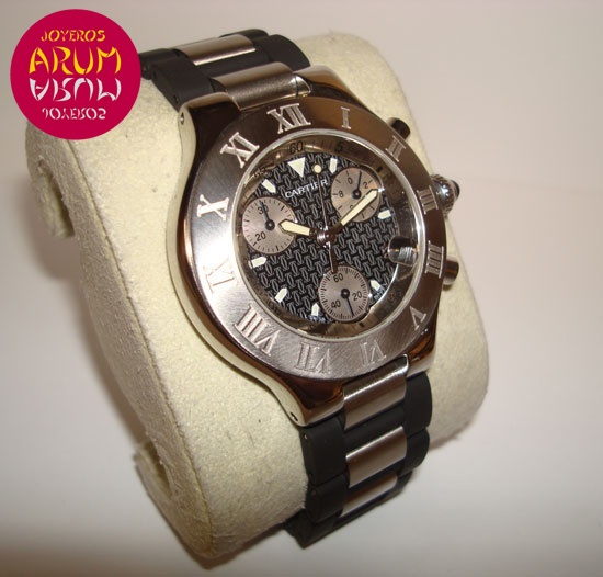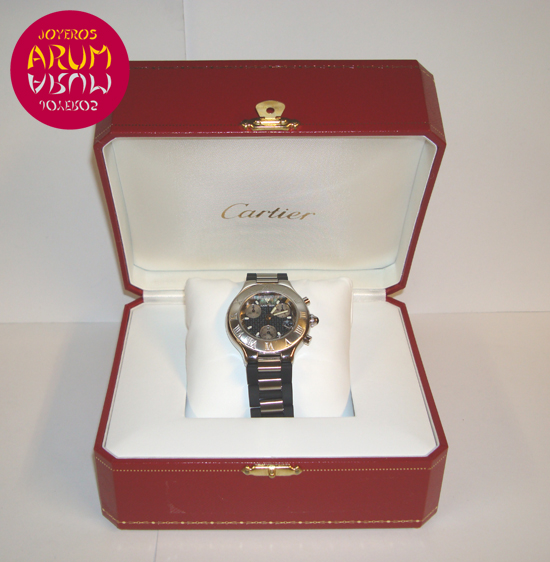 Description :steel, black dial decorated with the motif of the double C Cartier, steel bezel with roman numbers, sapphire crystal, quartz movement, chronograph, three indicators on the dial, seconds, minutes and hours, date at four with a magnifying glass, diameter 38 mm, cabochon crown decorated with a black rubber, black rubber strap, steel folding clasp.