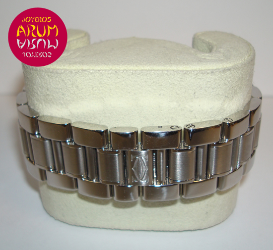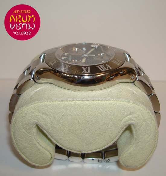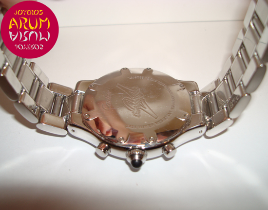 Description :steel, black dial decorated with Cartier double C, fixed bezel with roman numerals, sapphire crystal, quartz movement, chronograph, three indicators on the dial, seconds, minutes, hours, date at four with a magnifying glass, handles and luminescent dial , crown with protective rubber, diameter 38 mm, steel strap, hidden folding clasp.