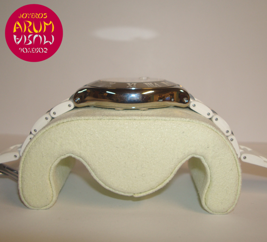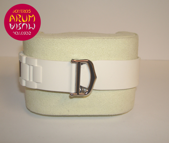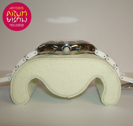 Description :steel, white dial decorated with the motif of the double C Cartier, steel bezel engraved with white roman numerals, sapphire crystal, quartz movement, Cartier caliber 272, chronograph, three indicators on the dial, seconds, minutes and hours, date at four with a magnifying glass, diameter 38 mm, cabochon crown decorated with a white rubber, black rubber strap, steel folding clasp.