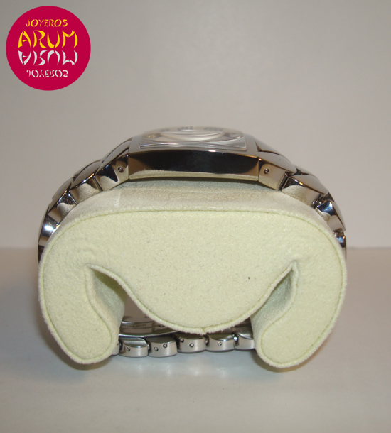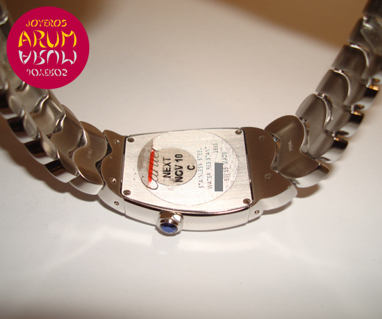 Description :lady’s watch, steel, white dial with roman numbers, smooth bezel, sapphire crystal, quartz movement, Cartier caliber 690, blued steel hands, octagonal crown decorated with spinel, diameter 28 mm, waterproof 30 meters, steel bracelet, hidden folding clasp.