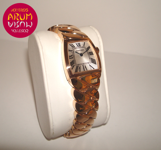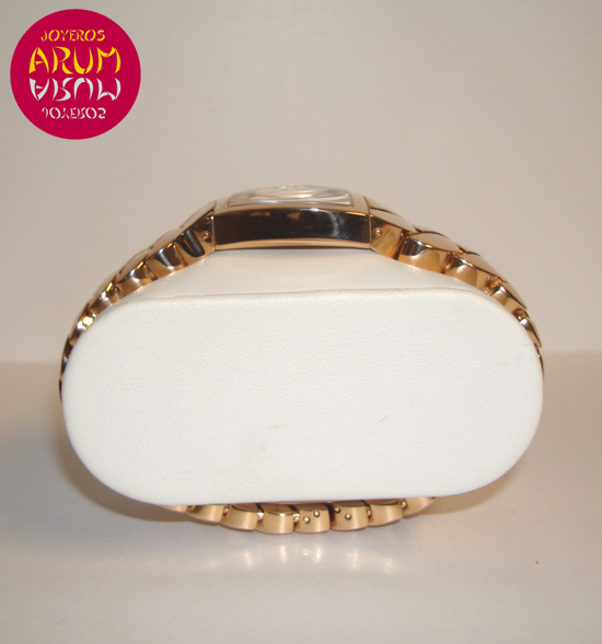 Description :lady’s watch, pink gold, silver dial, Roman numbers, smooth bezel, sapphire crystal, quartz movement, blue steel hands, octagonal crown decorated with precious stones, 22 by 22.5 mm diameter, 30 meters underwater, strap pink gold , hidden folding clasp.