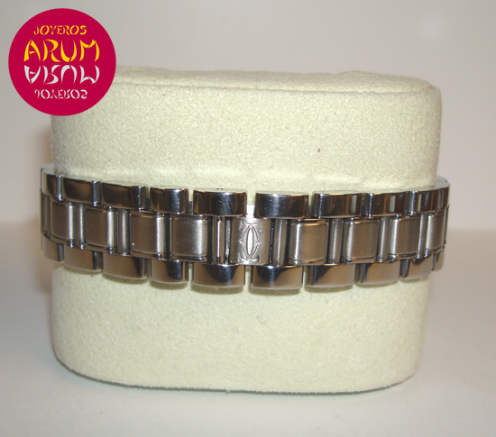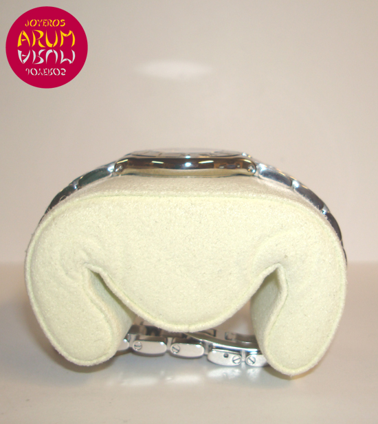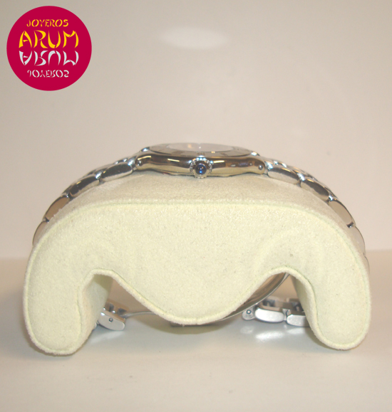 Description :ladies watch, steel, silver dial, bezel with roman numbers, quartz movement, blued steel hands, crown decorated with a spinel, diameter 27 mm, steel strap, hidden folding clasp.