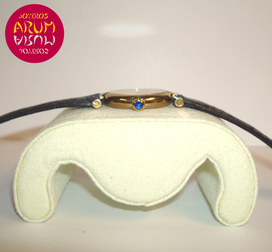 Description :ladies watch, plated steel, yellow dial, sapphire crystal, quartz movement, blued steel hands, crown decorated with a spinel, diameter 24 mm, blue leather strap, buckle closure.