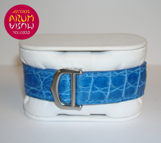 Description :lady’s watch, silver, white dial with roman numerals, sapphire crystal, quartz movement, center seconds, blue steel hands, date at three, screw crown, diameter 25 mm, blue leather strap, folding clasp.