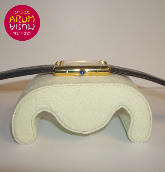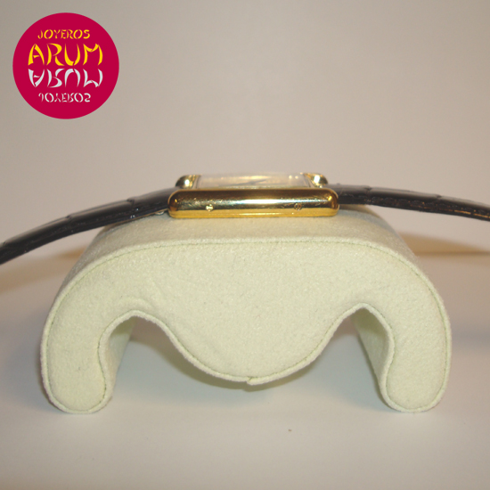 Description :lady’s watch, silver vermeil, white dial, sapphire crystal, quartz movement, blue steel hands, screw crown with gemstone, diameter 25 mm, black leather strap, buckle closure.