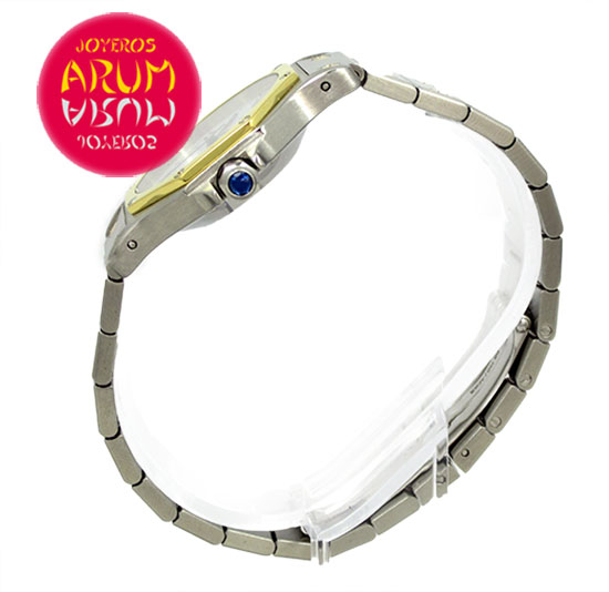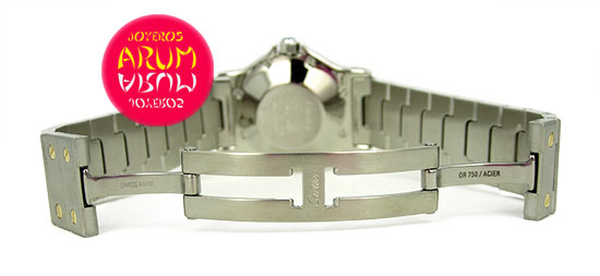 Description ::lady’s watch, steel and yellow gold, screw bezel, white dial with roman numerals, sapphire crystal, automatic movement, center seconds, blued steel hands, crown with gemstone, diameter 29 mm, steel strap, folding clasp.