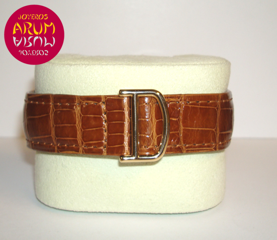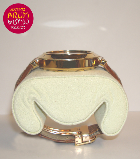 Description :yellow gold, blue dial, sapphire crystal, quartz movement, chronograph, three indicators on the dial, seconds, minutes, hours, date at six, crown with protector and two buttons decorated with cabochons, diameter 38,5 mm, brown leather strap, gold folding clasp.