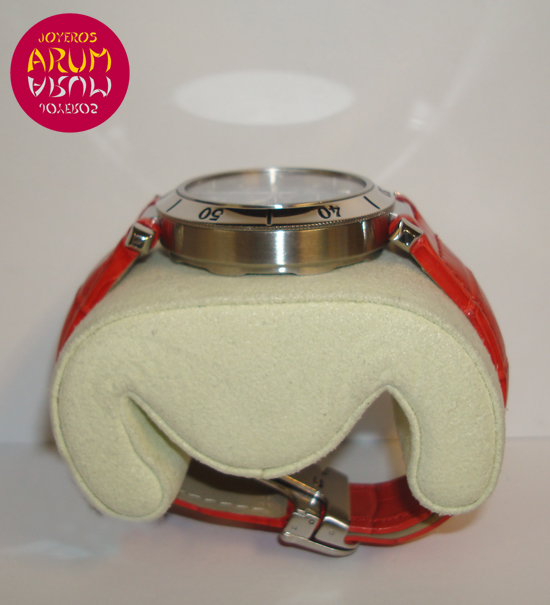 Description :steel, black dial, sapphire crystal, automatic movement, rotating bezel, chronograph, three indicators on the dial, seconds, minutes, hours, date at six, handles with luminescent indicators, screw crown with two buttons to right, diameter 38 mm, waterproof 30 meters, red leather strap, folding clasp.