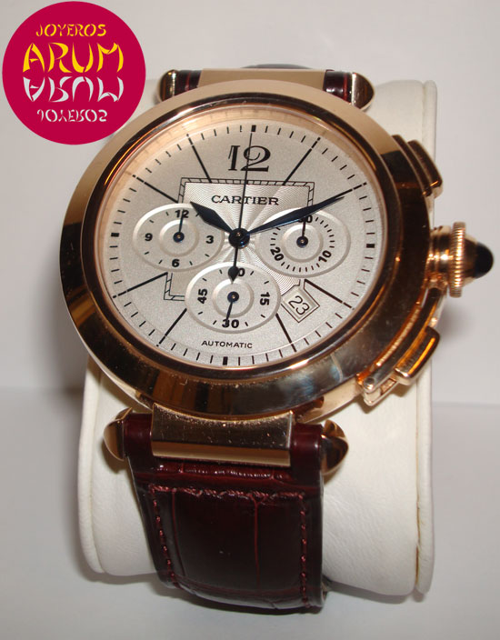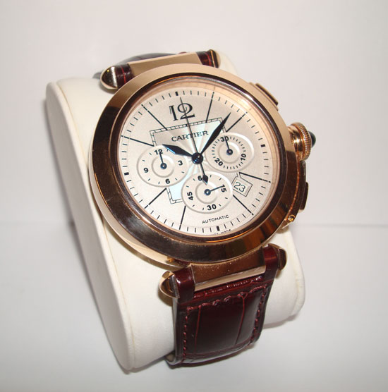Description :rose gold, sapphire crystal on both sides, transparent back cover, automatic movement, chronograph, date, diameter 42 mm, waterproof 30 meters, sapphire crown, leather strap, rose gold folding closure.