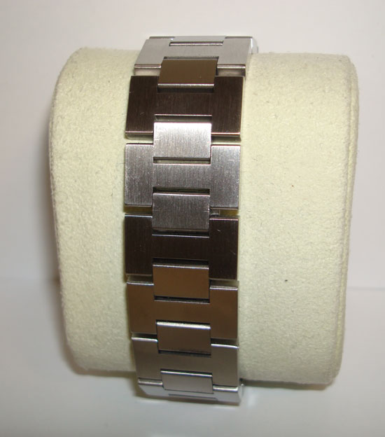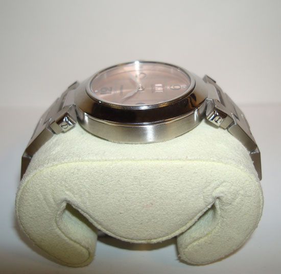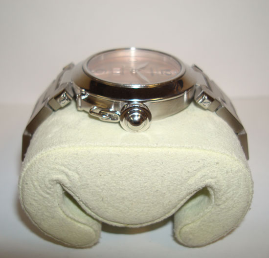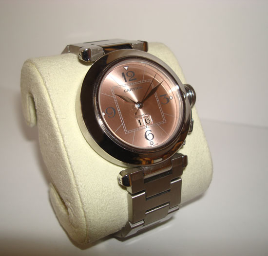 Description :steel, pink dial, smooth bezel, sapphire crystal, automatic movement, central second, date at six o’clock, crown protector, diameter 35 mm, waterproof 100 meters, steel strap, hidden folding clasp, year 2004.