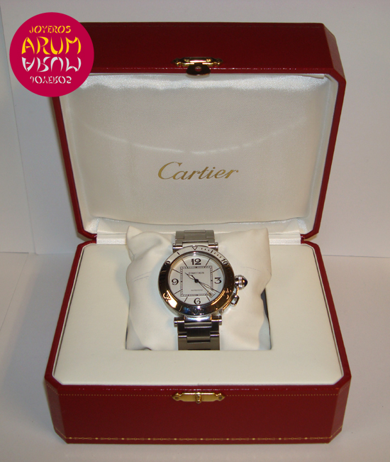 Description :steel, white dial, unidirectional rotating bezel, sapphire crystal, automatic movement, Cartier caliber 049, center seconds, luminescent hands with indicators, date between four and five, diameter 40 mm, waterproof 100 meters, screw crown decorated with a synthetic spinel, steel strap, steel folding clasp.