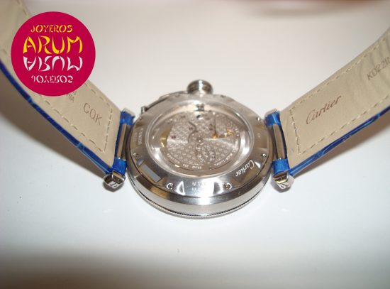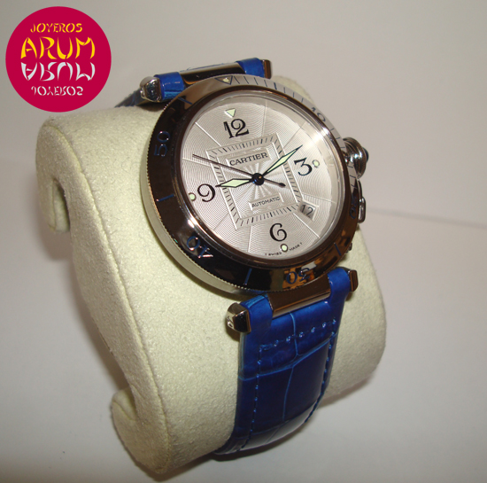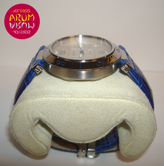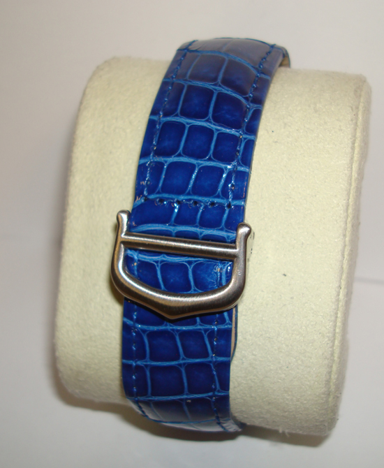 Description :steel, white dial, sapphire crystal, automatic movement, center seconds, blue steel hands with luminescent indicators, date between four and five, diameter 38 mm, crown decorated with a spinel, blue leather strap , steel folding clasp, 1999.