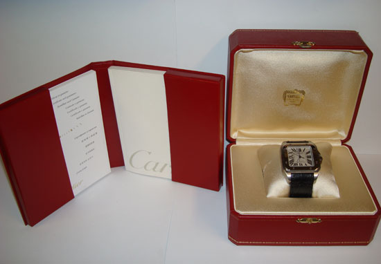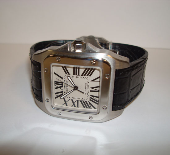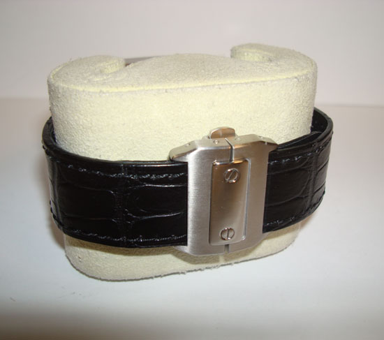 Description :large model, steel, white dial with roman numerals, sapphire crystal, screwed bezel, automatic movement, luminescent handles, center seconds, octagonal crown set with faceted spinel, waterproof 100 meters, 38.3 mm diameter 51.1 mm, black leather strap, folding clasp in steel.
