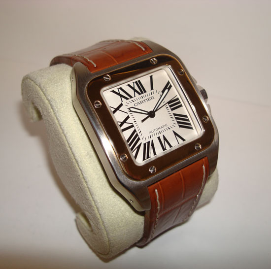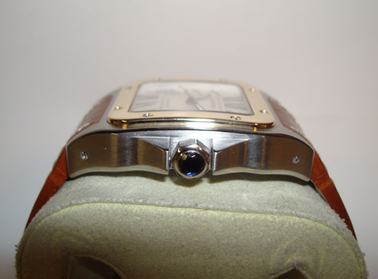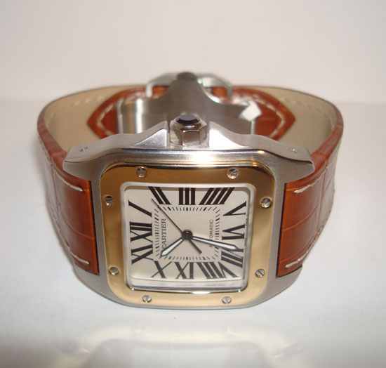 Description :steel and yellow gold, gold screwed bezel, sapphire crystal, white dial with roman numerals, center seconds, luminescent handles, automatic movement, crown with gemstone, diameter 38 mm, waterproof 100 meters, leather strap, folding clasp.