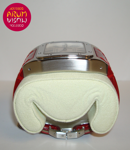Description :steel, white dial with roman numbers, screw bezel, sapphire crystal, automatic movement, center seconds, luminescent indicators handles, octagonal crown decorated with a faceted spinel, diameter 38 mm, waterproof 100 meters, red leather strap, folding clasp steel, year 2008.