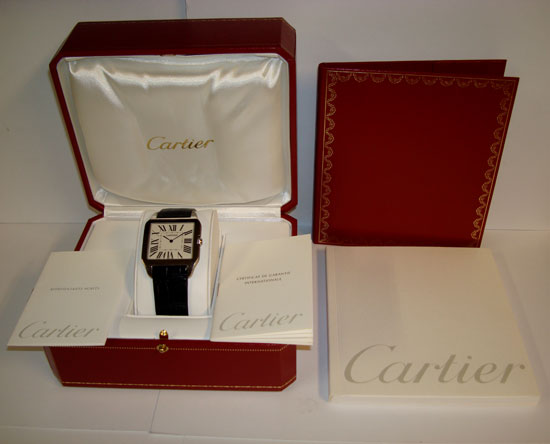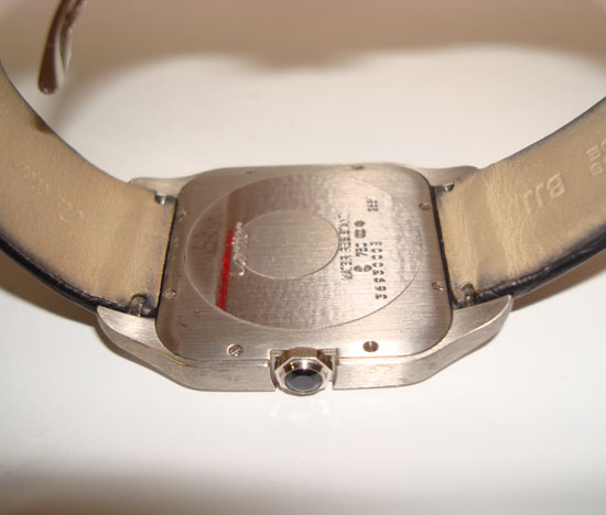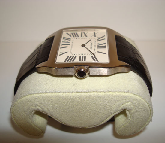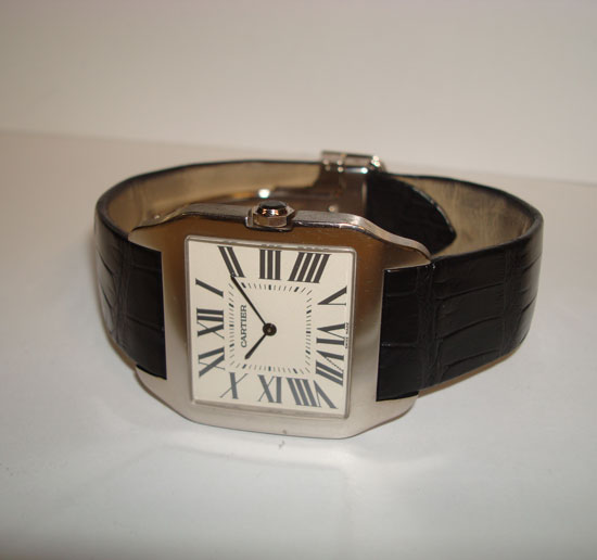Description :white gold, sapphire crystal, manual movement, white dial, roman numerals, crown with stone, diameter 35 mm, water resistant 30 meters, diameter 35 mm, black leather strap, folding clasp.