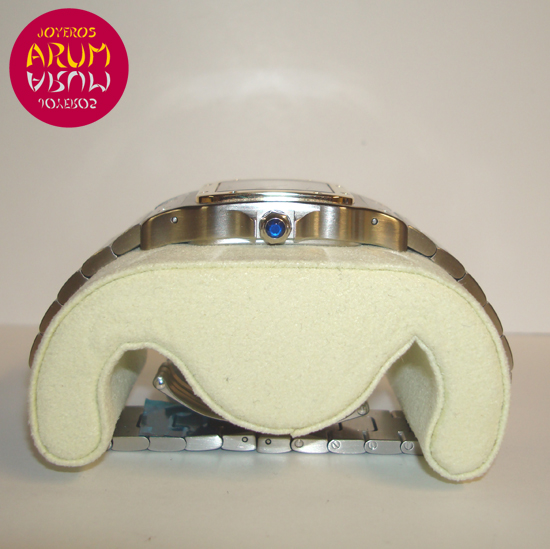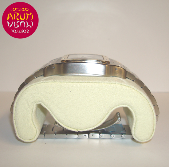 Description :steel and yellow gold, white dial with roman numbers, screw bezel, sapphire crystal, automatic movement, center seconds, blue steel hands, date between four and five, octagonal crown set with a spinel, diameter 35 mm by 45, 5 mm, steel strap, hidden folding clasp, year 2006.