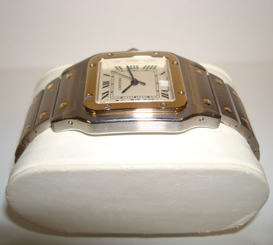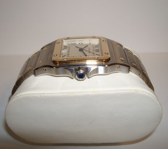 Description :lady’s watch, steel and yellow gold, white dial with roman numerals, screw bezel, sapphire crystal, quartz movement, date at six, octagonal crown set with faceted spinel, diameter 29 mm, steel strap, hidden folding clasp.