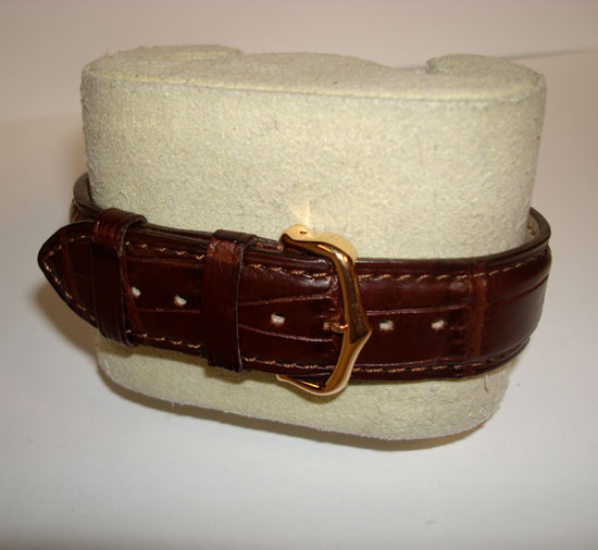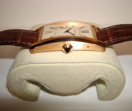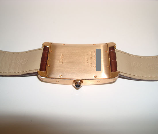 Description :rose gold, sapphire crystal, automatic movement, center seconds, date, blue steel hands, Cartier caliber 120, octagonal crown with faceted sapphire, water-resistant 30 meters, diameter 27 mm, brown leather strap, buckle closure.