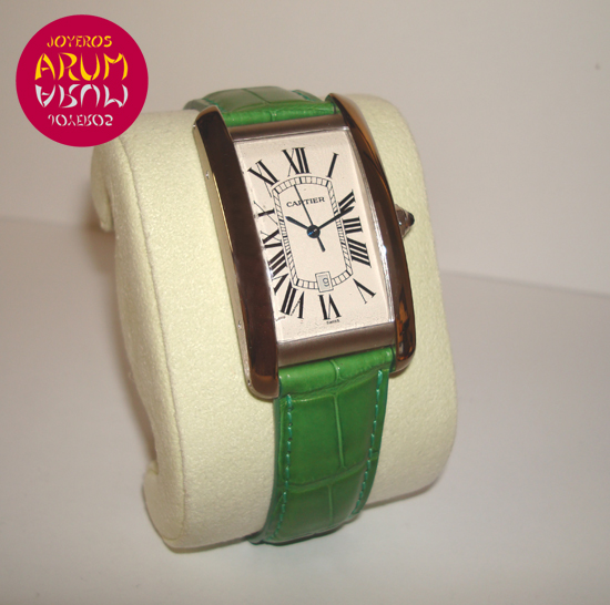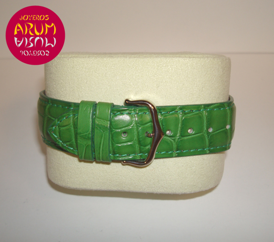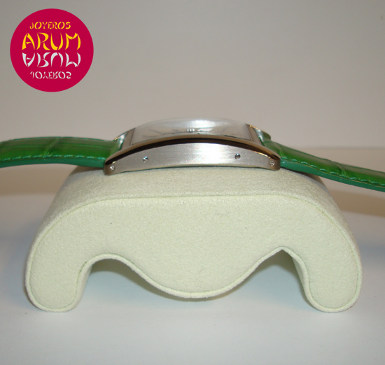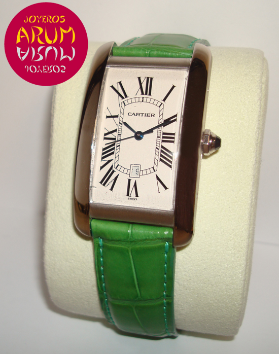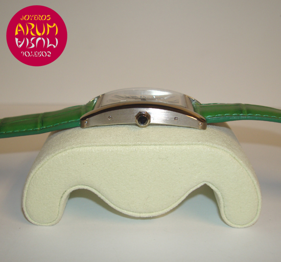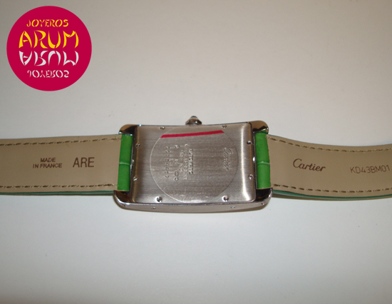 Description :white gold, white dial with roman numbers, sapphire crystal, automatic movement, Cartier caliber 120, central seconds, blued steel hands, octagonal crown, diameter 26 mm, green leather strap, buckle closure, year 2008.
