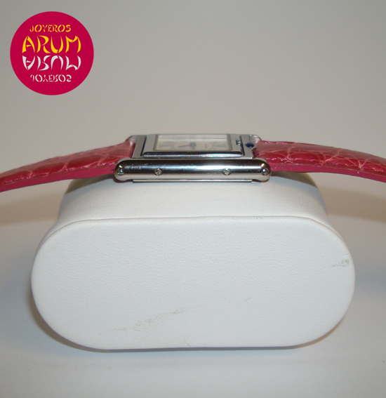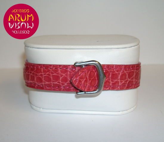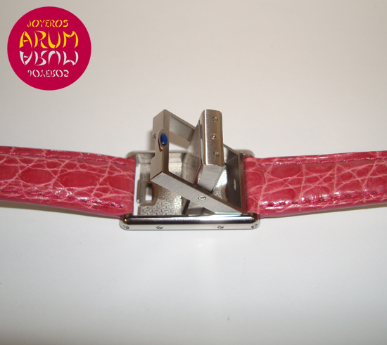 Description :lady’s watch, steel, white dial with roman numbers, sapphire crystal, quartz movement, blued steel hands, bezel decorated with spinel, diameter 22 mm, pink leather strap, folding clasp in steel.
