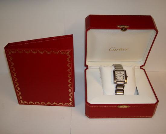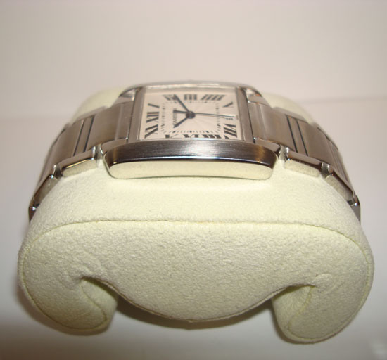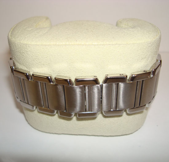 Description :steel, white dial with roman numerals, sapphire crystal, automatic movement, center seconds, blue steel hands, date at six, octagonal crown decorated with a cabochon spinel, Cartier caliber 120, diameter 28 mm, steel strap, hidden folding clasp.