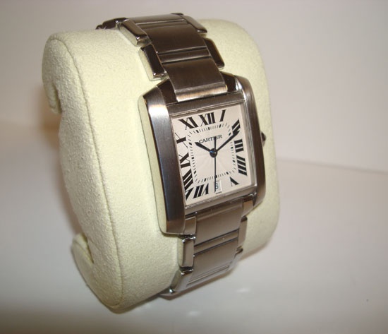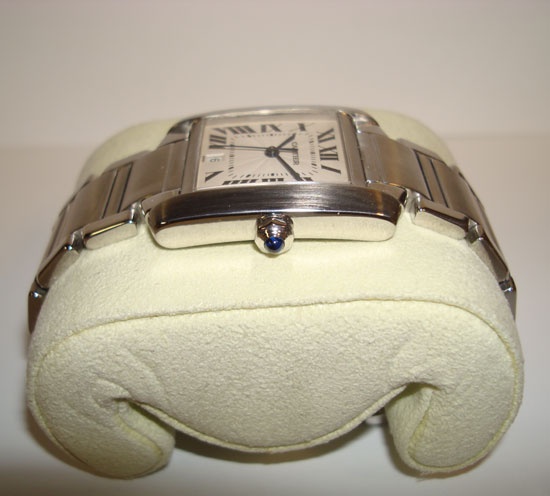 Description :steel, white dial with roman numbers, sapphire crystal, automatic movement, Cartier caliber 120, central second, date at six, octagonal crown decorated with a cabochon-shaped spinel, blue steel hands, diameter 28 mm, steel strap, hidden folding clasp.