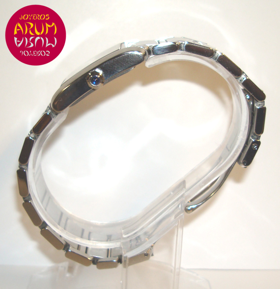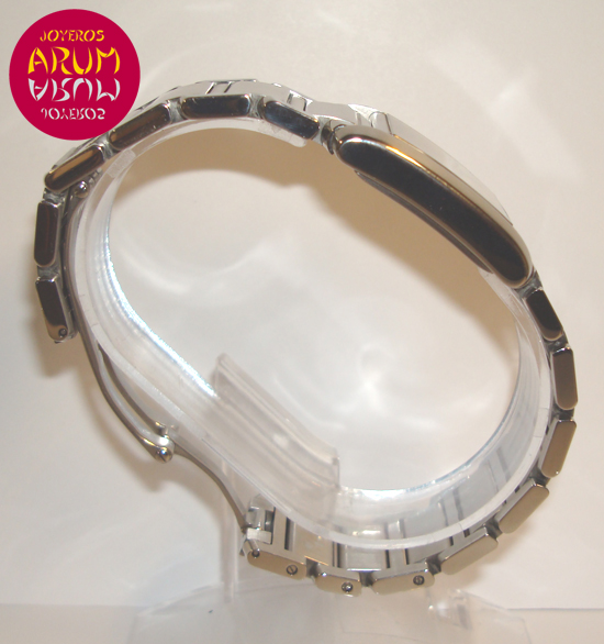 Description :steel, white dial with roman numbers, sapphire crystal, quartz movement, date at three, blued steel hands, octagonal crown decorated with a spinel cabochon, diameter 24 mm, steel strap, hidden folding clasp, year 2009.