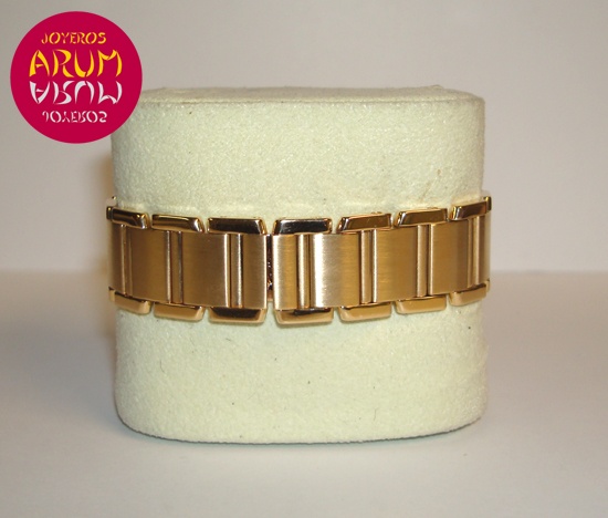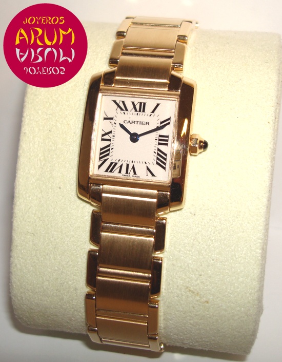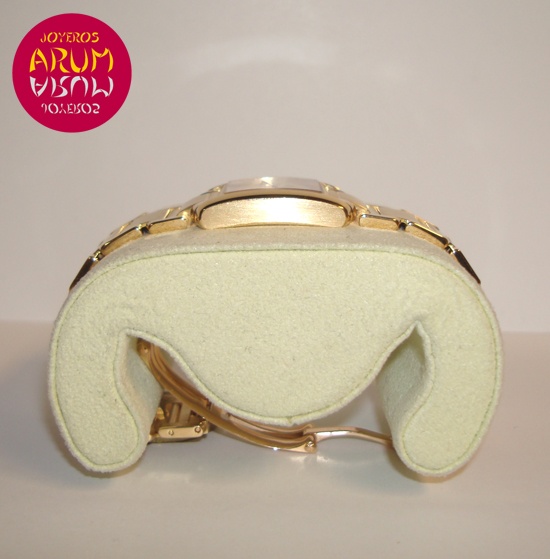 Description :lady’s watch, yellow gold, white dial with roman numbers, smooth bezel, sapphire crystal, quartz movement, blued steel hands, crown decorated with a sapphire cabochon, diameter 20 mm, yellow gold strap, hidden folding clasp, year 2008.