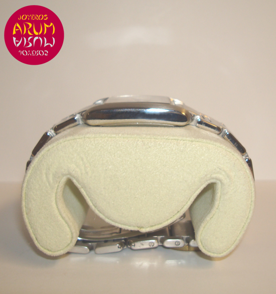 Description :steel, white dial with roman numbers, sapphire crystal, automatic movement, Cartier caliber 120, central second, date at six, octagonal crown decorated with a cabochon shaped spinel, blue steel hands, diameter 28 mm, steel strap, hidden folding clasp.