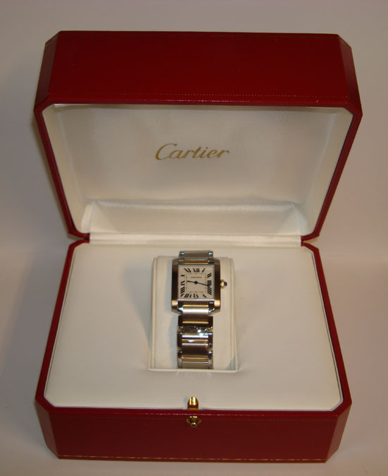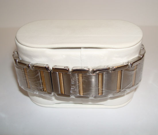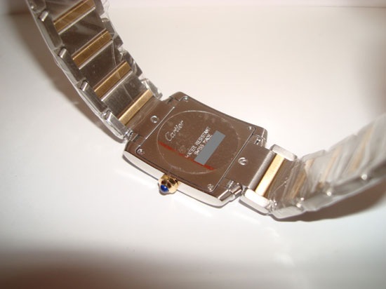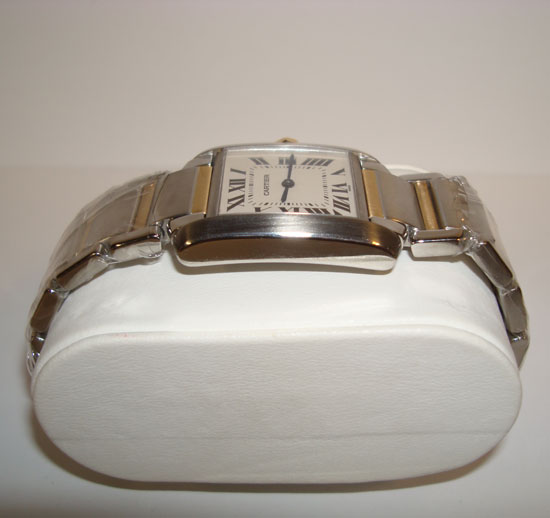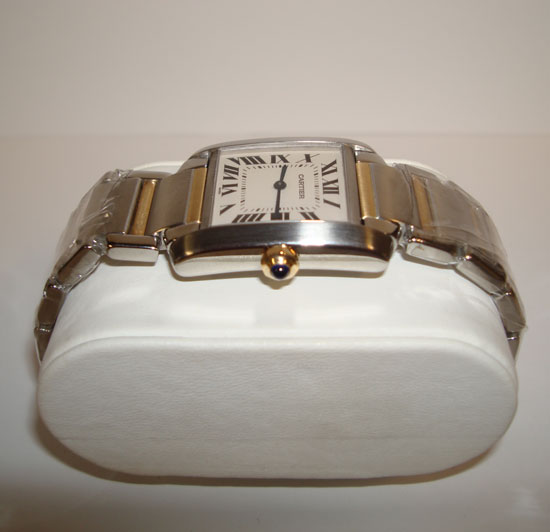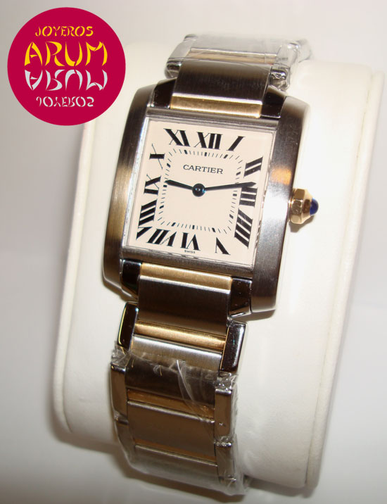 Description :steel and yellow gold, white dial with roman numerals, sapphire crystal, quartz movement, Cartier caliber 057, crown set with a spinel, diameter 25 mm, steel and yellow gold strap, folding clasp hidden.