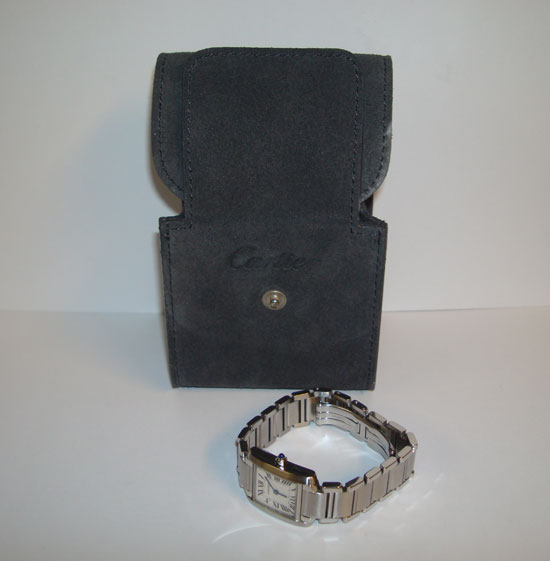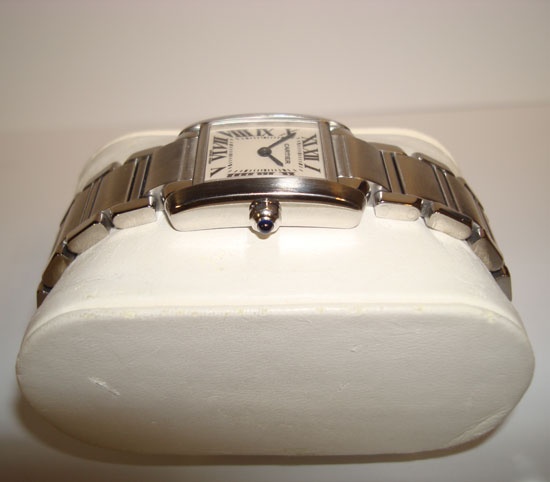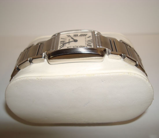 Description :ladies watch, steel, white dial with roman numbers, sapphire crystal, quartz movement, Cartier caliber 057, central second, octagonal crown decorated with a cabochon-shaped spinel, blue steel hands, diameter 20 mm, steel strap, hidden folding clasp.