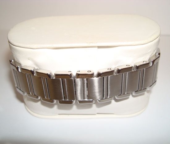 Description :steel, white dial with roman numbers, sapphire crystal, quartz movement, Cartier caliber 057, central second, octagonal crown decorated with a cabochon-shaped spinel, blue steel hands, diameter 20 mm, steel strap, hidden folding clasp, year 2009.