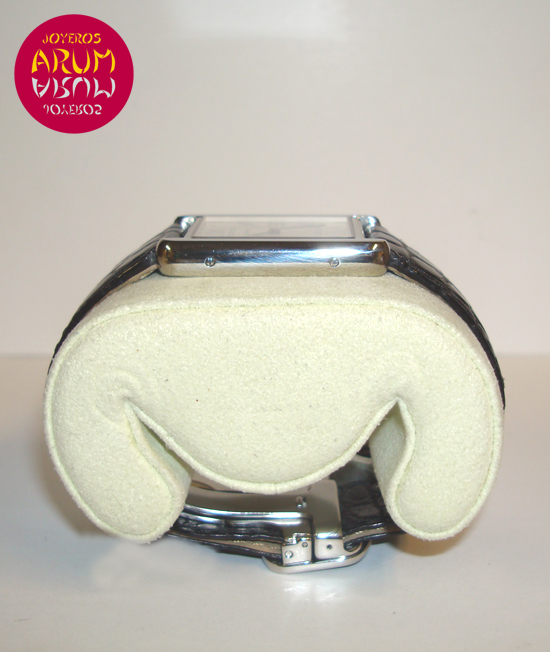 Description :steel, white dial with roman numbers, sapphire crystal, quartz movement, smooth bezel, blue steel hands, diameter 26.5 mm, crown decorated with spinel cabochon, waterproof 30 meters, black leather strap, folding clasp of steel, year 2007.