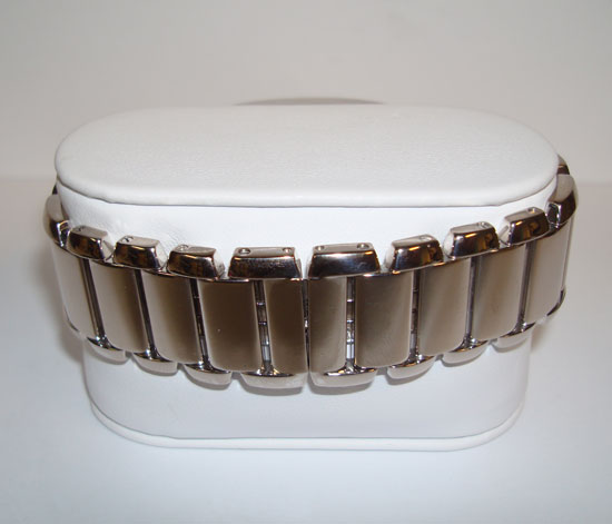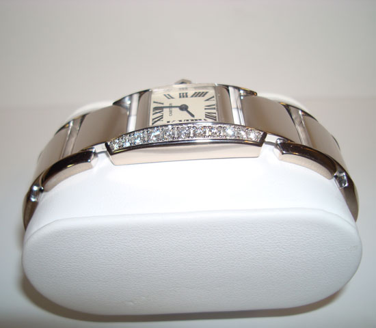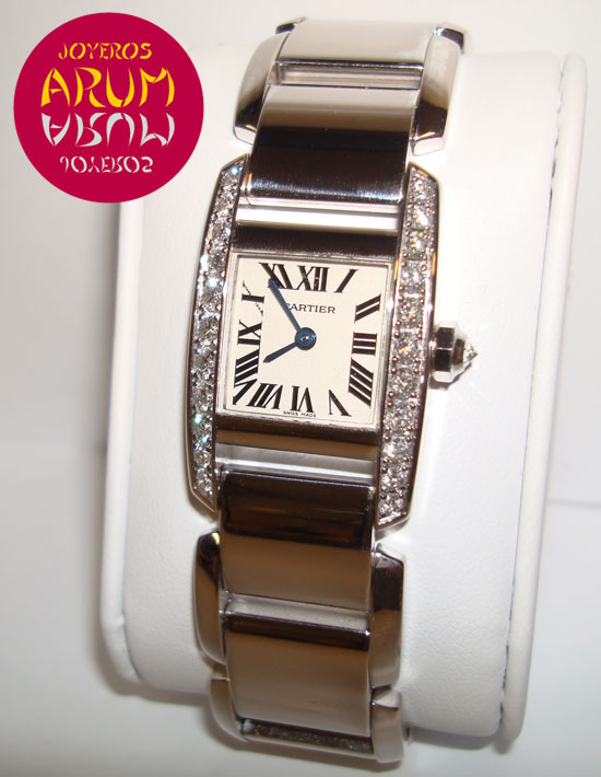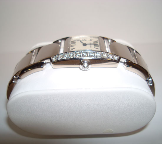 Description :white gold, diamonds on both sides of the dial, white dial with roman numerals, blued steel hands, sapphire crystal, quartz movement, diameter 20 mm, 30 meters water resistant, white gold strap, hidden folding clasp.